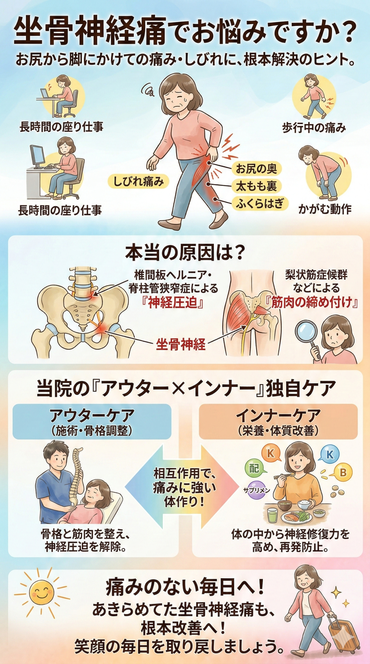 椎間板ヘルニアや脊柱管狭窄症による坐骨神経痛は、実は腰だけの問題ではありません。当院では慢性腰痛の悪化や膝痛の併発、さらには体内環境までを考慮した独自の視点で、あなたの「手術したくない」という想いに応えます。
