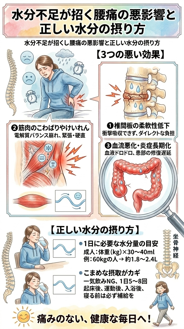 ・水分不足は椎間板の機能低下、筋肉の硬直、血流障害を引き起こす
