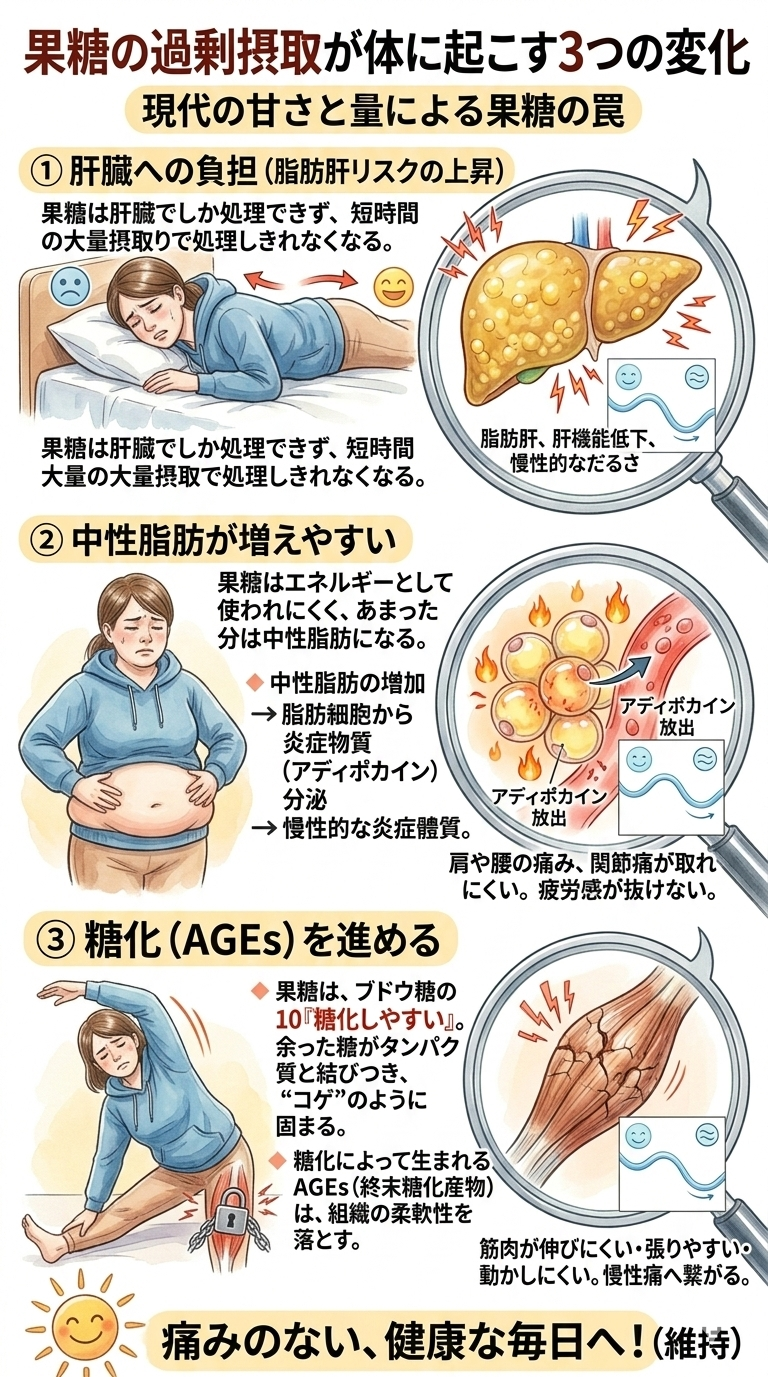 ここでは、果糖をとりすぎたときに体で起きる3つの変化を説明します。